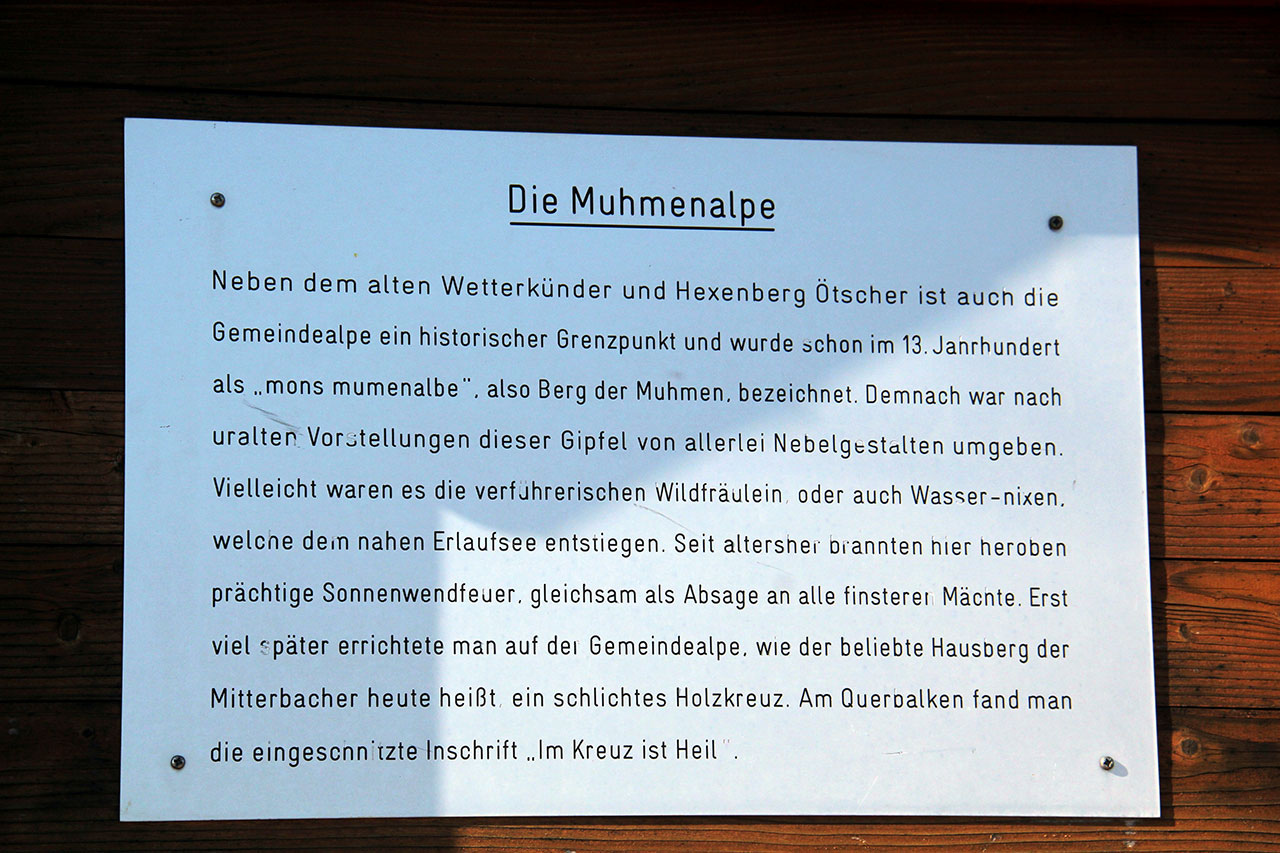 Die Gemeindealpe hieß früher auch die "Muhmenalpe". Sowohl auf dem Hexenberg Ötscher als auch auf der Gemeindealpe sollen sich früher allerlei Geister und Feen getummelt haben, weshalb sie im 13.Jahrhundert als "mons mumenalbe", also Berg der Muhmen bezeichnet wurde. Demnach war nach uralten Vorstellungen der Gipfel von allerlei Nebelgestalten umgeben. Vielleicht waren es die verführerischen Wildfräulein oder auch Wassernixen, die dem nahen Erlaufsee entstiegen. Seit alters her brannten hier oben gleichsam als Absage an alle finsteren Mächte Sonnwendfeuer. Erst viel später errichtete man auf der Gemeindealpe, dem beliebten Hausberg der Mitterbacher, ein Gipfelkreuz.